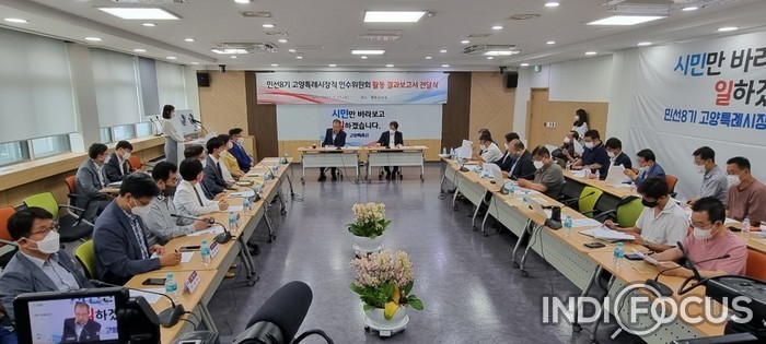 고양시장직 인수위는 27일 오전 고양시 평화누리실에서 37일간의 활동 결과보고와 함께 8대 62개 정책안을 전달했다. 사진/김은해 © 인디포커스