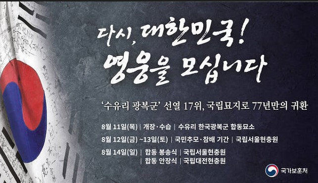 국가보훈처는 '다시, 대한민국! 영웅을 모십니다'라는 주제로 11일 묘소 개장과 12~13일 임시 안치, 국민 추모·참배 기간 운영에 이어 14일 합동봉송식 및 합동안장식 순으로 거행된다고 밝혔다.