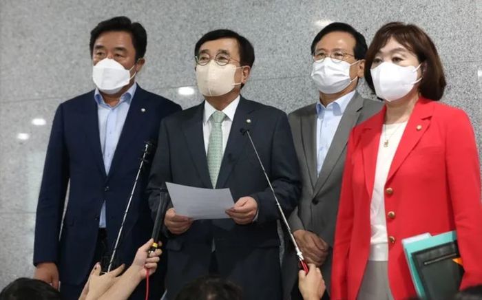 ▲ 서병수 국민의힘 전국위원회 의장(왼쪽 2번째)이 5일 상임전국위원회를 마친 뒤 취재진에게 결과를 발표하고 있다. © 국회사진기자단