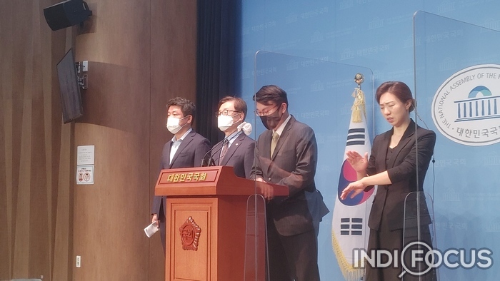 ▲ 회견 후 기자들의 질문을 받고 있는 유의동(왼쪽), 윤상현(가운데), 최재형(오른쪽) 의원. © 이태훈 기자