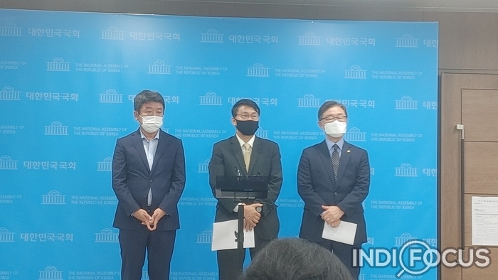 ▲ 회견 후 기자들의 질문을 받고 있는 유의동(왼쪽), 윤상현(가운데), 최재형(오른쪽) 의원. ©이태훈 기자