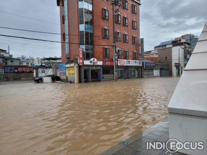 힌남노 태풍의 영향으로 많은 비가 내린 포항시내가 물에 잠기는 모습을 볼 수 있다.