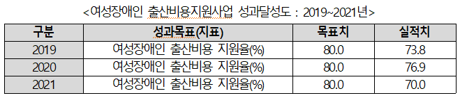 ▲ <2019~2021년 여성장애인 출산비용지원사업 성과달성도> © 최종윤 의원실 제공