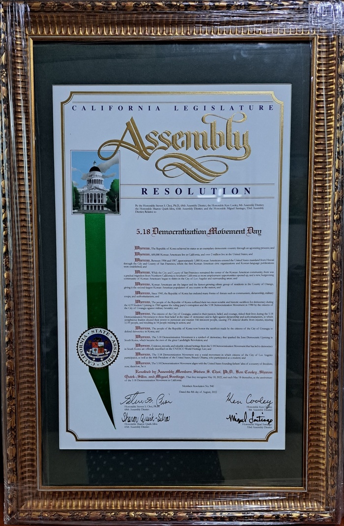 그러므로, 캘리포니아 주 의회에서는 결의하여 2022년 5월 18일과 그 이후 매년 5.18 캘리포니아 민주화 운동의 기념일로 선언한다.