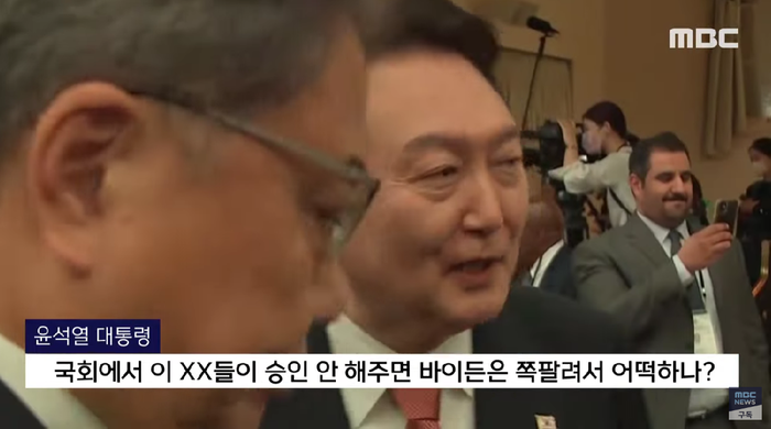 ▲ 윤석열 대통령이 21일(현지시간) 미국 뉴욕에서 열린 글로벌펀드 7차 재정공약회의 직후 회의장을 걸어나오면서 비속어가 섞인 발언을 해 논란을 일으켰다. © MBC 뉴스 캡쳐