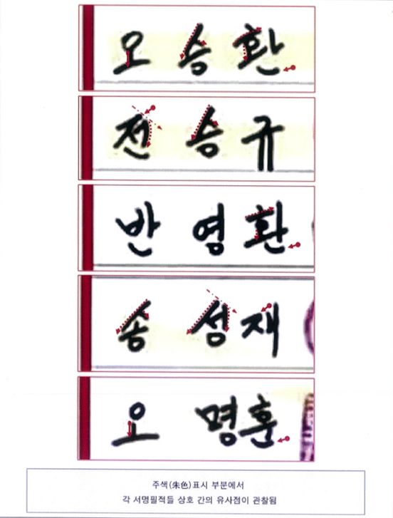 감정은 필적감정 전문기관인 A 문서감정연구소에서 맡았다. 연구소는 "5인의 서명필적은 모두 굵은 촉 사인펜으로 추정되는 동일한 필기구로 기재된 것"이라며 "전체적인 배자형태, 자획의 구성미 및 운필(펜의 움직임)의 숙련정도 등의 안목검사에서 상호 유사한 형태수준의 필적으로 분석된다"고 결론지었다.