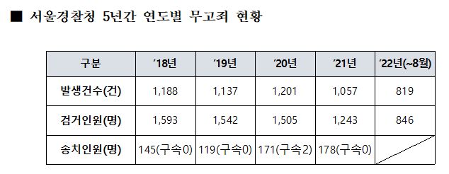 국민의힘 정우택 의원(국회 행정안전위원회)이 서울경찰청에서 제출받은 '5년간 연도별 무고죄 현황' 자료에 따르면, 지난 2018년부터 2022년 8월까지 서울에서 무고죄로 검거된 피의자 수는 6729명이다. 이 가운데 검찰에 넘겨져 구속된 피의자 수는 2020년 기준 단 2명뿐이었다.
