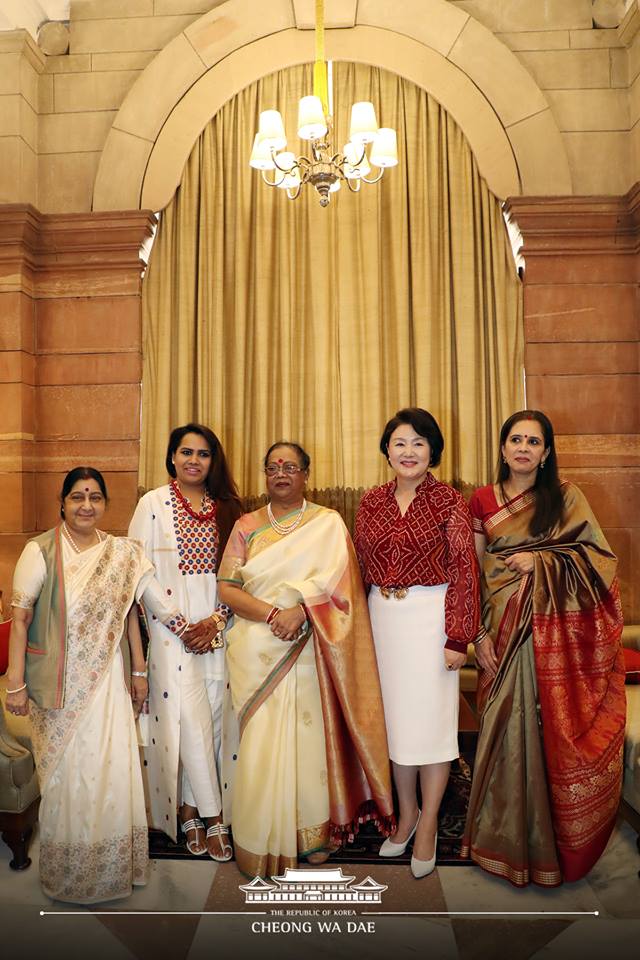 김 여사는 2018년 11월 4일부터 3박4일간 인도를 방문했다. 문 대통령 동반 없이 단독 방문이었으나 대한민국 대통령 휘장을 동반한 채 대통령 전용기를 이용해 부적절한 과잉 의전이란 논란이 일었다. 심지어 문 대통령과 함께 불과 4개월 전 공식일정으로 인도를 다녀왔었기에 ‘외유성 해외유람’이라는 비아냥도 나돌았다.