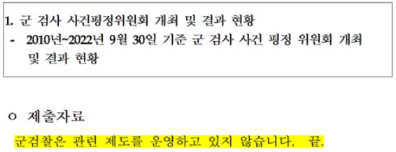 국방부가 14일 더불어민주당 이탄희 의원실에 제출한 '2010~2022년 군 검사 사건평정위원회 개최 및 결과 현황' 자료에 따르면, 군검찰은 평정위를 운영하지 않고 있는 것으로 드러났다.