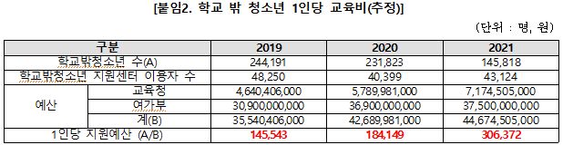 ▲ 학교 밖 청소년 1인당 추정 교육비(표). © 서동용 의원실 제공