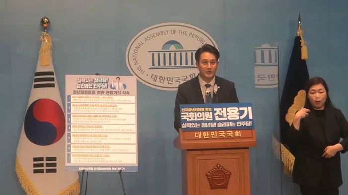 ▲ 더불어민주당 전용기 의원이 25일 국회 소통관에서 기자회견을 열고, 청년위원장 선거에 출마할 뜻을 밝히고 있다. © 공동취재사진