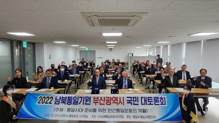 부산에서는 10월 26일 오후 2시 통일회관3층 수선화홀에서 100여명이 참가한가운데 주종기 13기 민주평화통일자문회의 부산부의장의 환영사,신동성 사) 남북통일운동국민연합 부산 공동회장의 격려사를 했다. 이어 박만순 통일교육전문교수부산대표가 발제했으며 토론자로는 황현정 통일희망봉사단장 고유미 민주평화통일자문회의 청년위원,박성열 피스로드 재단 부산회장이 하였다. 박형준 부산광역시 시장의 축전과 백종헌,황보승희,안병길,이주환,전봉민 국회의원의 축사가 소개됐다.