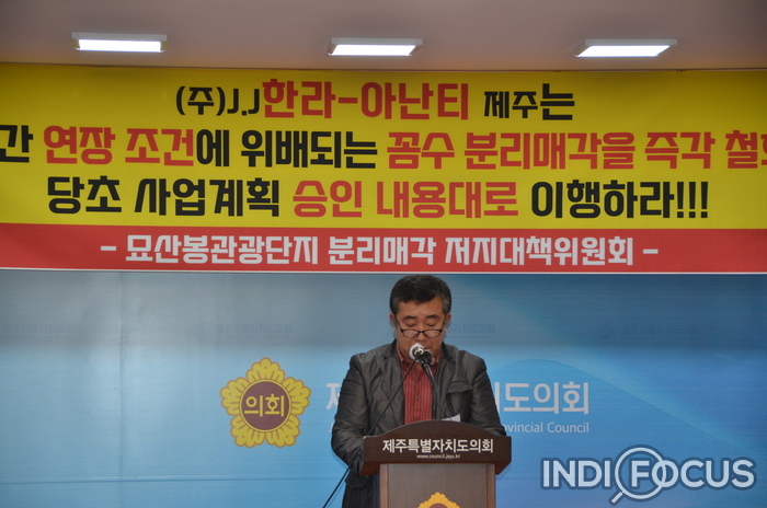 ![]() ▲26일 오전 10시 제주도의회 1층에서 묘산본관광단지분리매각 저지대책 위원이 기자회견을 하고 있다. © 인디포커스 |