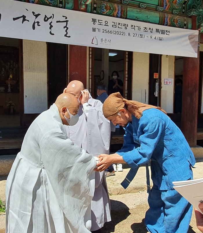 ▲ 김진량 도예가가 봉은사 스님들과 인사를 나누고 있다 ©김중건