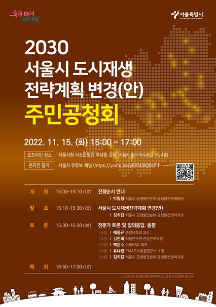 서울시가 지난해 6월 ‘2세대 도시재생’으로의 방향 전환을 발표한 이후 이를 구체적으로 실현하기 위한 ‘도시재생전략계획 변경’을 추진하고 있는 가운데 오는 11월 15일(화) 오후 3시 서울시청 후생동 강당에서 일반시민·전문가·공무원 등이 참여하는 ‘2030 서울시 도시재생 전략계획 변경(안)’ 공청회를 개최한다.