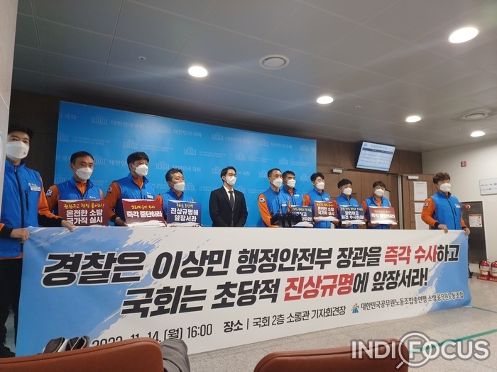 [국회 = 인디포커스] 이태훈 기자 = 소방공무원들이 뿔났다. 대한민국공무원노동조합총연맹 소방공무원 노동조합(소방노조)은 14일 이상민 행정안전부 장관에 대한 '즉각 입건'과 '수사'의 필요성을 주장하며, 이 장관을 향해 "10.29 참사의 책임을 인정하고 사퇴할 것을 요구한다"고 말했다.