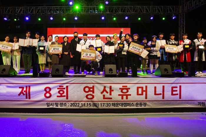 ▲ 와이즈유 영산대학교가 지난 15일 '제8회 영산 휴머니티 콘테스트'를 진행하고 수상자들이 기념촬영을 하고 있다. © 김중건