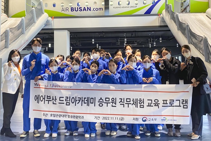 와이즈유 영산대학교 항공관광학과 학생들이 에어부산 승무원 교육 체험프로그램에 참가하고 기념촬영을 하고 있다.