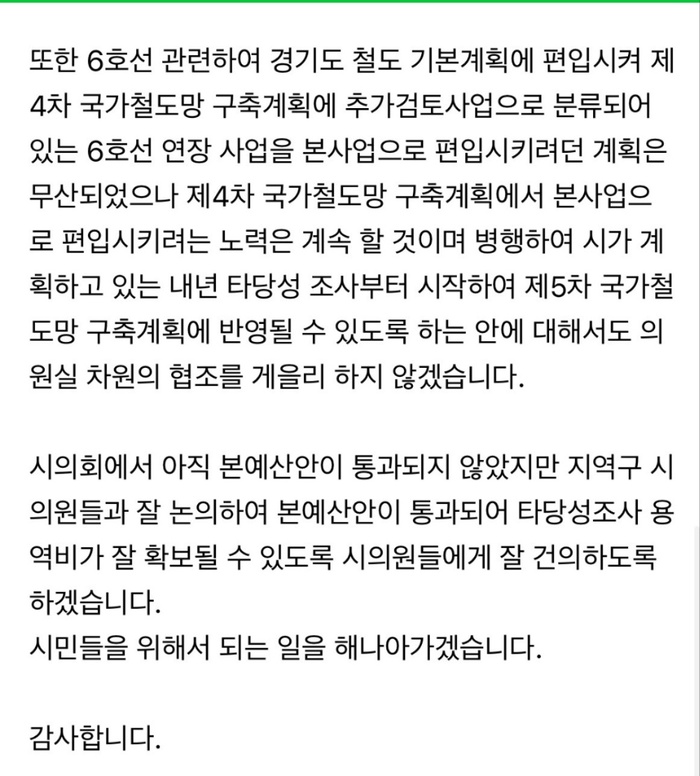 6호선 연장 사업과 관련해서도 "지하철 6호선 와부 연장(안)에 대한 경기도 철도 기본계획 편입(안)이 남양주시가 사업신청을 하지 않아 무산되었으며, 남양주시는 내년 초 타당성 조사를 시작으로 제5차 국가철도구축계획에 반영할 계획이라고 밝혔다"고 적었다.