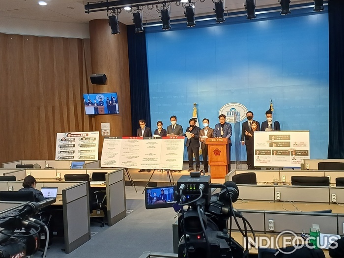 ▲ 민주당 검찰독재정치탄압대책위원회(이하 대책위)는 23일 오후 국회 소통관에서 기자회견을 열고 '윤석열 사단'이 장악한 서울중앙지검이 선택적 수사와 편의적 기소를 일삼고 있다며 강하게 피한했다. © 이태훈 기자