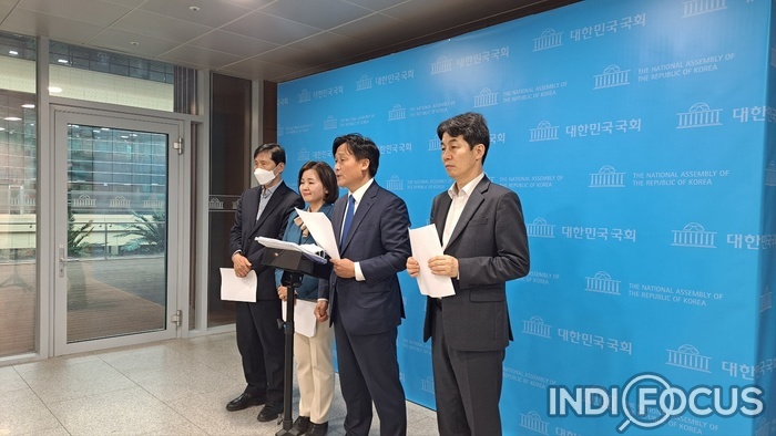 ▲ 더불어민주당 국회 환노위 위원 일동은 28일 오후 국회 소통관에서 기자회견을 열고 환노위 여당 간사인 임이자 의원에 일명 '노랑봉투법'으로 불리우는 '노동조합법 개정안'의 환노위 법안심사 소위원회 안건 상정에 참여해줄 것을 촉구했다. © 김은해 기자