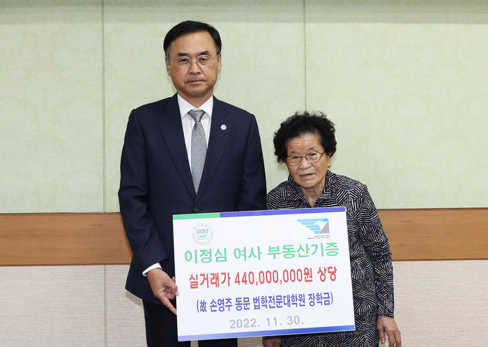부산대학교(총장 차정인)는 11월 30일 오후 5시 대학본부 5층 총장실에서 부산대 법학과 90학번 故 손영주(52세) 동문의 어머니인 이정심(79세) 여사가 아들이 공부했던 부산대 법학전문대학원의 학생들을 위한 장학금으로 써달라며 부산 해운대구에 소재한 4억 4,000만 원(실거래가) 상당의 아파트를 기증했다고 1일 밝혔다.