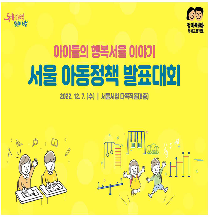 서울시는 자라나는 아이들이 내 삶에 영향을 주는 서울시 아동정책을 평가하고, 직접 정책을 발굴해 서울시에 제안하는 행사가 열린다. 서울시는 7일(수) 13시 30분 서울시청 8층 다목적홀에서 「‘아이들의 행복서울 이야기’ 서울 아동정책 발표대회」를 개최한다고 밝혔다.