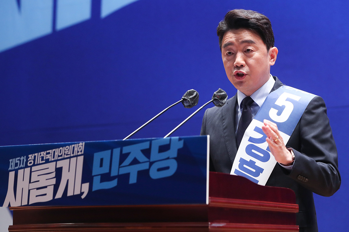 ▲ 더불어민주당 강훈식 당시 당대표 후보가 당 5차 정기전국대의원회에서 모두발언을 통해 정견을 발표하고 있다. © 공동취재사진