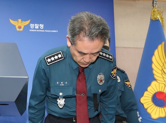 ▲ 윤희근 경찰청장이 지난 10월 서울 서대문구 경찰청에서 10.29 참사와 관련한 대국민 사과 입장 표명 기자회견에서 고개를 숙이고 있다. © 공동취재사진