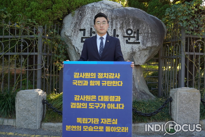 ▲ 더불어민주당 김남국 의원이 감사원을 찾아 문재인 전 대통령에 대한 감사원의 조사를 규탄하는 1인 시위를 가졌다. © 김남국 의원실 제공