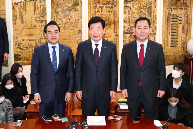 ▲ 김진표 국회의장이 15일 국회 의장실에서 열린 내년도 예산안 협상을 위한 여야 원내대표 회동에서 여야 원내대표와 함께 기념촬영을 하고 있다. 왼쪽부터 더불어민주당 박홍근 원내대표, 김 의장, 국민의힘 주호영 원내대표. © 공동취재사진