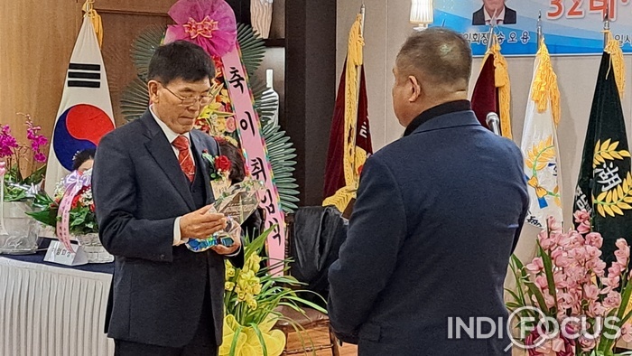 32대 송오용 회장이 33대 신임 회장에게 추대패 및 명패를 수여하고 있다. 사진/김은해 ©인디포커스