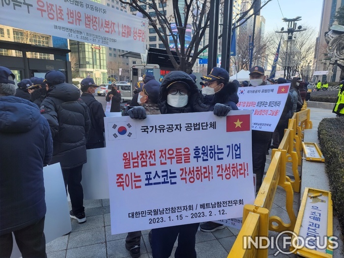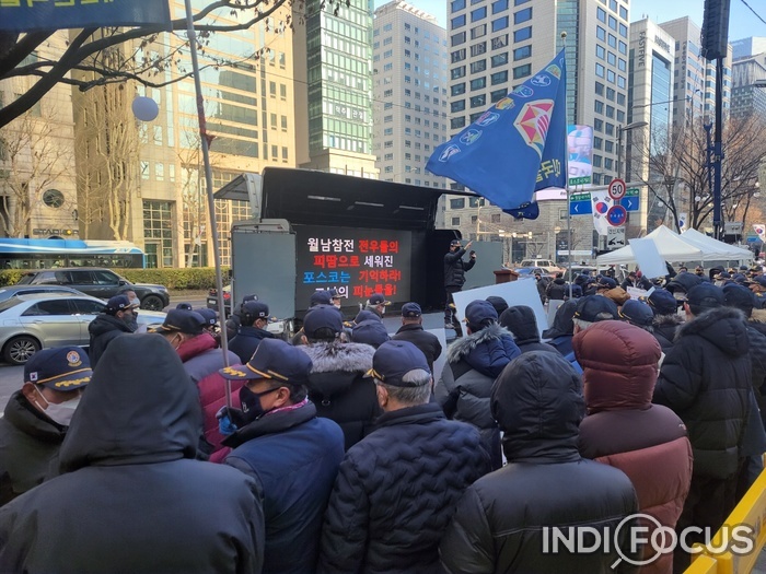 ▲ 18일 오전 10시 서울 포스코 본사 앞에서 베트남참전전우회와 대한민국월남참전자회(이하통칭'전우회')약 1천여명은 최 회장의 퇴진을 강하게 요구하고 있다. ©인디포커스