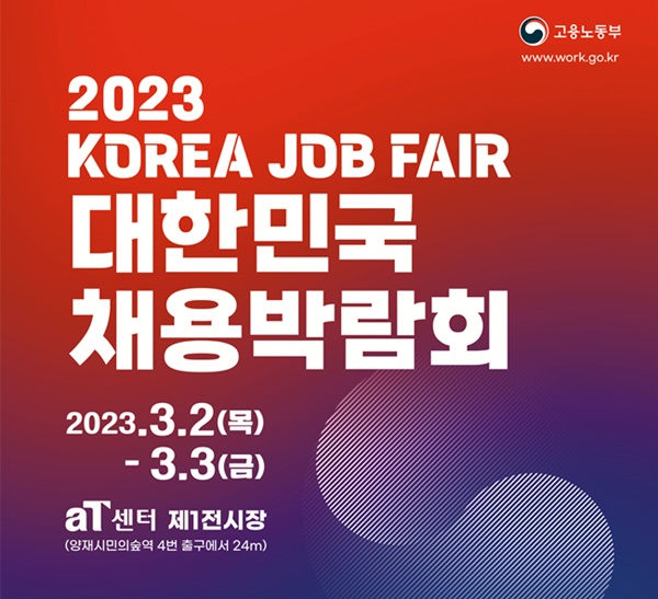 고용노동부는 오는 20일 부터 3월 31일까지 「 2023 대한민국 채용박람회」(온라인)를 개최, 특히 3.2.(목)~3.3.(금) 양일간은 aT센터 제1전시장(서울 서초구 강남대로 27)에서 오프라인 행사를 진행한다고 밝혔다.