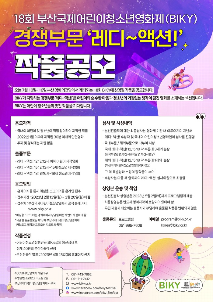 작품 접수기간은 오는 2월 13일부터 3월 20일까지이며 공식 홈페이지(www.biky.or.kr)를 통해 접수한다. 주제와 형식에는 제한이 없으며 국내외 어린이 및 청소년이 직접 참여하여 제작한 작품이어야 하고, 2022년 1월 이후에 제작된 30분 이내의 단편영화라면 출품 가능하다.