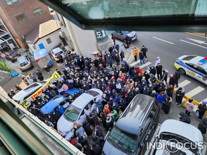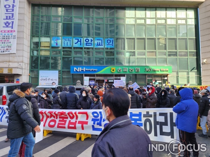 ![]() 조합원들이 송파구 거암교회 앞에서 시위를 하고 있다. 사진/제보자© 인디포커스 |