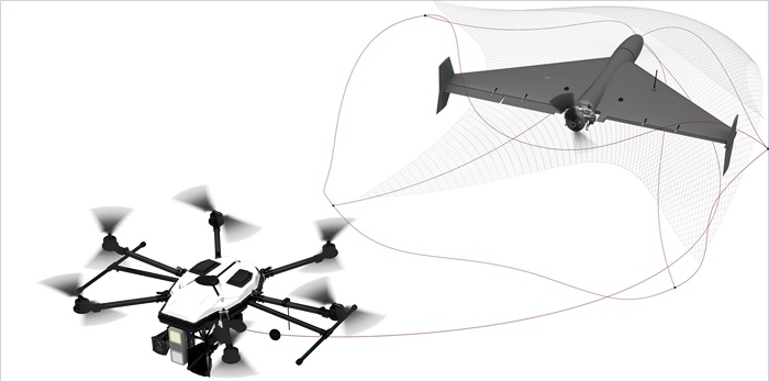 ▲AI기능을 탑재한 드론이 불법 드론을 그물로 포획해 무력화하는 포르템 테크놀로지스의 불법 드론 대응 시스템