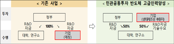 정부와 반도체 업계가 민관공동 연구 개발(R&D)사업을 위해 반도체 인력양성과 연구개발 생태계 조성을 위한 투자 참여 및 협력 지원 등의 업무 협약(MOU)을 체결, 금년부터 10년간 총사업비 2,228억 원을 50대50으로 투자하여 산업계가 필요한 반도체 전체 분야의 핵심기술 확보 및 실전형 고급인력 양성을 위해 전방위적으로 지원할 예정이다.