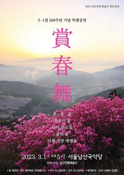 우리춤소리극 ‘상춘무(賞春舞)’ 공연이 3월 1일(수) 오후 5시 서울남산국악당 크라운해태홀에서 공연이 개최된다. 3·1절 104주년을 기념해 남산전통예술단(대표 배철성)이 주최, 주관하는 첫 번째 무대다.
