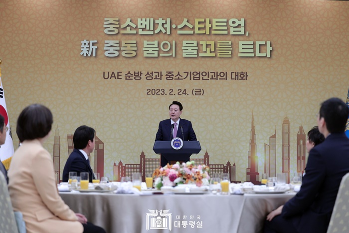 윤석열 대통령은 지난 1월 UAE 순방 경제사절단에 참여한 중소벤처·스타트업과 이후에 UAE 등 중동시장에서 수출계약 등 성과를 창출한 중소벤처기업 30여명을 용산 대통령실로 초청, 이영 중조벤처기업부 장관이 참석한 가운데 오찬 간담회를 가졌다.