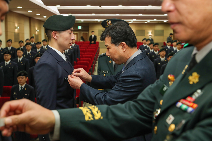 ▲ 동아대 ROTC 입단 및 승급식에서 이해우 총장이 학년장을 수여하고 있다. © 김중건