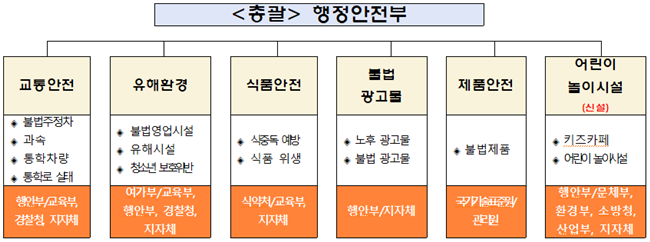 개학기, 학생안전 위해요인 제거 및 안전한 학교환경 조성을 위해 정부가 전국 6,000여개 초등학교 등 주변 보호구역 및 어린이 놀이시설을 대상으로 5주간 합동(총 975개 기관 참여 )으로 안전 점검・단속에 나선다.