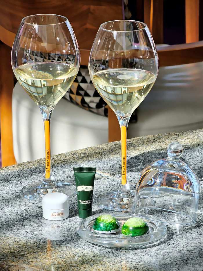 라 메르의 스킨케어 체험 키트는 크렘 드 라메르 (3.5ml)와 컨센트레이트 (3ml)로 구성돼 있다. 호텔에서 도보 5분 거리에 위치한 현대백화점의 라 메르 매장 방문 시 추가 기프트를 받을 수 있는 바우처도 함께 제공된다. 식사 후에는 라 메르의 브랜드 컬러를 담은 초콜렛 봉봉과 함께 뵈브 클리코 샴페인 한 잔이 테이블로 서비스 된다. 건강한 피부를 위한 재료로 만들어진 초콜릿 봉봉은 발효시킨 레몬타임 에센스, 패션 프루츠와 파인애플 가나슈, 마카다미아 크런치의 플레이버로 영롱한 반짝임이 돋보인다. 파크 하얏트 서울의 이지명 셰프의 섬세한 손끝에서 탄생한 초콜릿 봉봉은 아름답게 빛날 여성을 응원하는 메시지를 담았다. 또한 여성의 성공을 상징하는 샴페인으로 유명한 뵈브 클리코 샴페인 한 잔을 제공해 함께 즐길 수 있도록 했다.