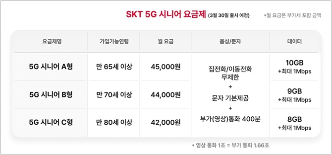 SKT는 이번 5G 요금제 혁신 중 만 65세 이상 시니어 고객을 위한 신규 요금제 3종을 3월 30일(목) 먼저 출시한다.