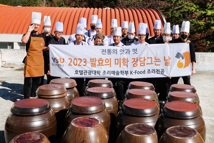 와이즈유 영산대학교(총장 부구욱) 조리예술학부 K-Food조리전공이 새 학기를 맞아 최근 한식 전통문화 계승을 위한 ‘장 담그기’ 행사를 진행했다.