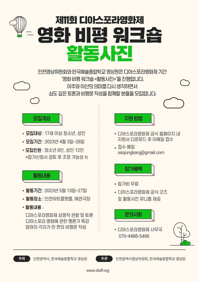 모든 프로그램은 무료로 운영되며, 영화 비평 워크숍 <활동사진> 모집 및 교육에 관한 보다 자세한 사항은 디아스포라영화제 공식 홈페이지(www.diaff.org) 공지사항에서 확인할 수 있다.