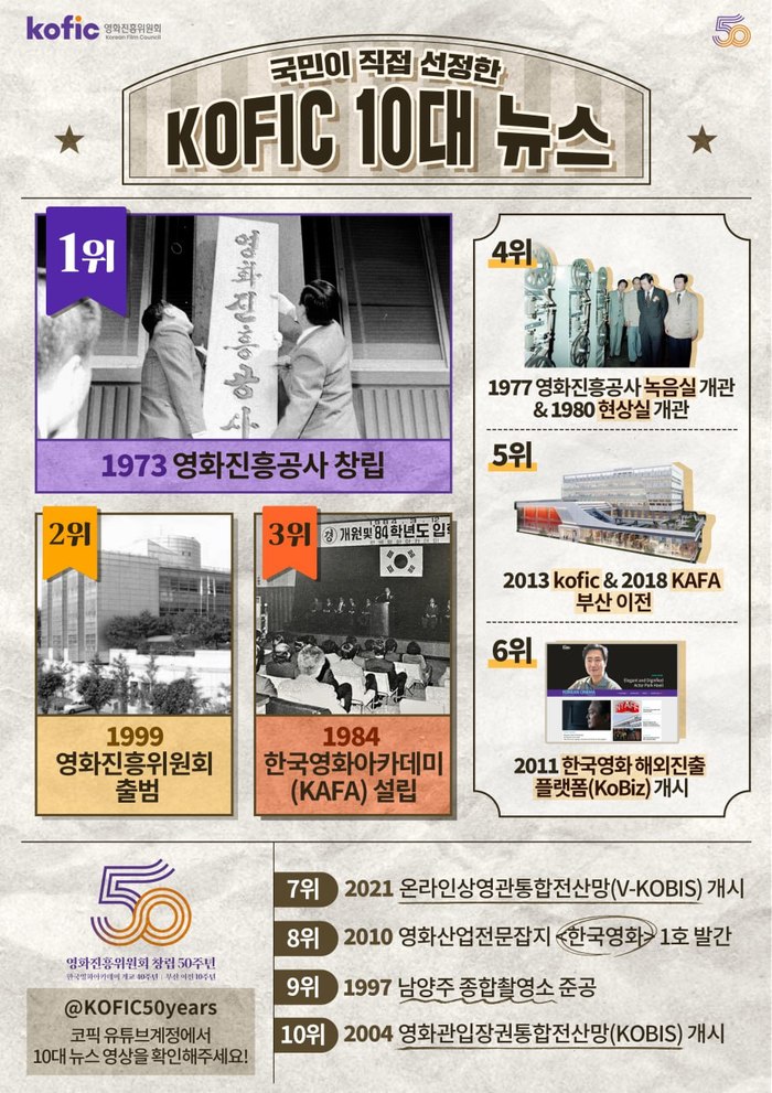 코픽은 국민이 직접 뽑은 10대 뉴스를 바탕으로 코픽 공식 유튜브 계정을 통해 특별 영상을 공개했다. 영상은 코픽 유튜브 채널에서 확인할 수 있다(https://www.youtube.com/@KOFIC50years).