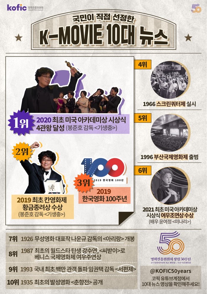 또한 K-무비 10대 뉴스는 '2020년 <기생충(봉준호 감독)>의 최초 미국 아카데미상 시상식 4관왕 달성'이 1,042표로 1위를 차지했고 이어서 '2019년 <기생충>의 최초 칸영화제 황금종려상 수상(651표)', '2019년 한국영화 100주년(423표)', '1966년 스크린쿼터제 실시(422표)', '1996년 부산국제영화제 출범(401표)', '2021년 윤여정 배우의 최초 미국 아카데미상 시상식 여우조연상 수상(<미나리>)(357표)', '1926년 무성영화 대표작 나운규 감독의 <아리랑> 개봉(332표)', '1987년 최초의 월드스타 탄생(故강수연 배우, <씨받이>로 베니스국제영화제 여우주연상)(324표)', '1993년 <서편제(임권택 감독)>의 국내 최초 백만 관객 돌파(312표)', '1935년 최초의 발성영화 <춘향전> 공개(297표)' 순으로 선정됐다.