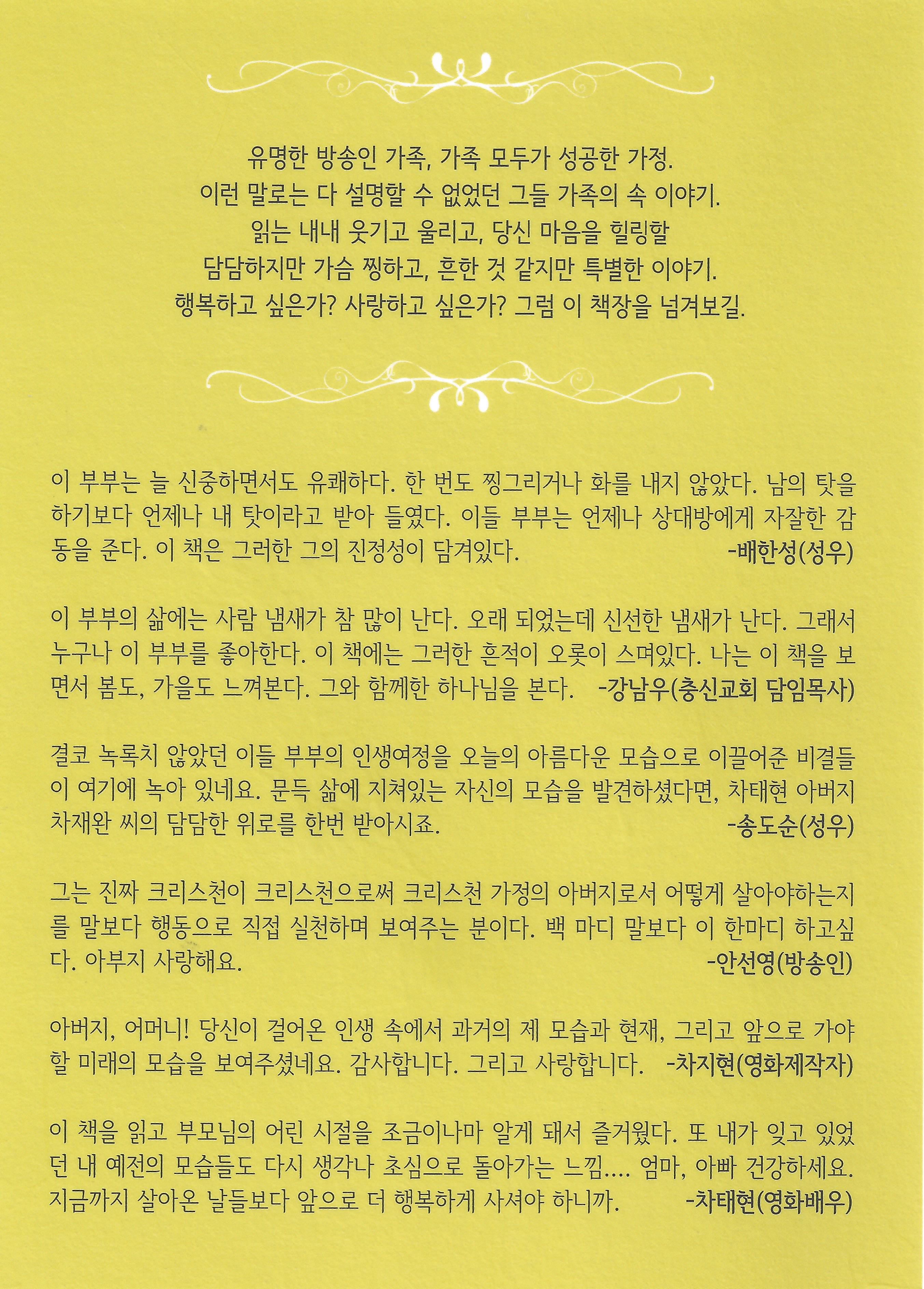 그들은 아직도 많은 꿈을 꾸고 더 많은 사랑을 하고 나눠주고 싶어한다. 그래서 우리는 그들과 함께하고 싶어 하는지 모른다. 이 책을 통해 아직도 진행 중인 그들의 사랑에 동참해 보자.
