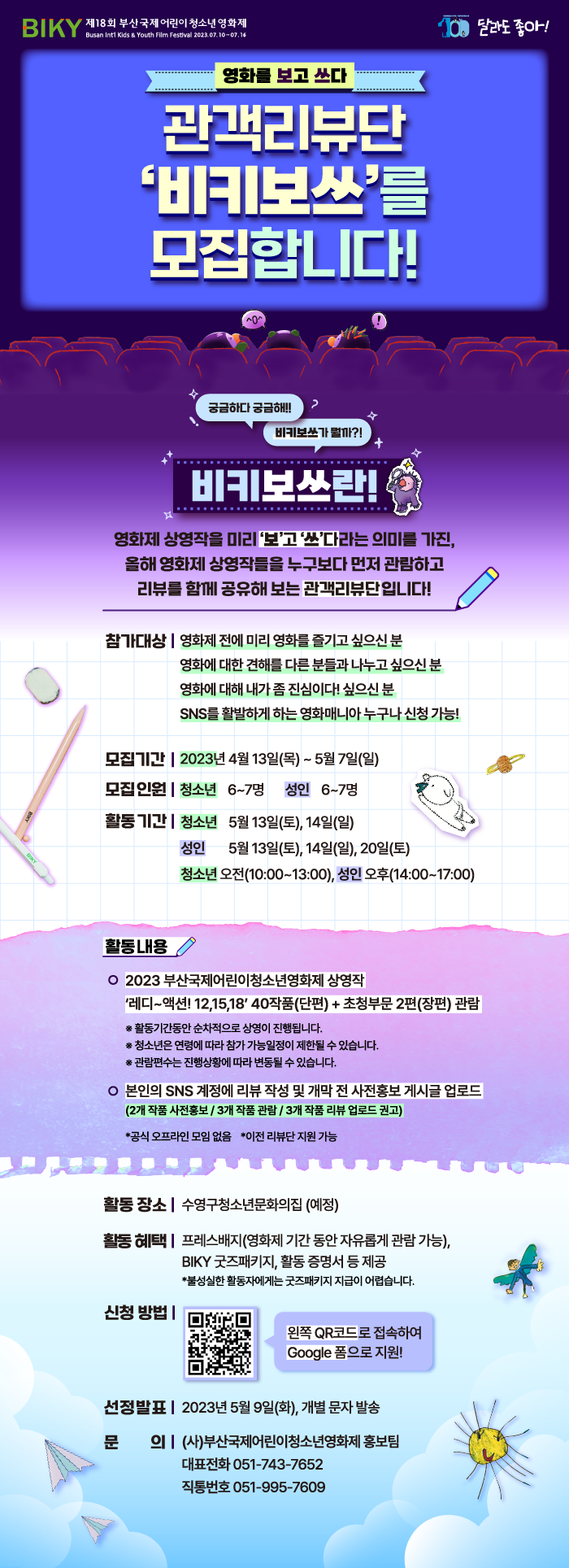오는 7월에 개최하는 제18회 부산국제어린이청소년영화제(이하 BIKY)에서 관객리뷰단 ‘비키보쓰’를 지난 13일부터 모집하고 있다.